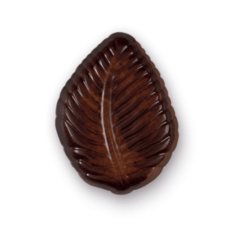 Elegant herfstblaadje met een omhulsel van gemarmerde melkchocolade en een verrassende vulling van zachte praliné met knisperende gepofte rijst.