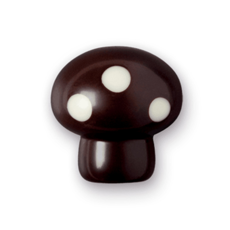 Paddenstoel van pure chocolade met witte stippen, gevuld met een rijke vulling van chocolademousse. Om je in 1,2,3 in herfstsferen te brengen.